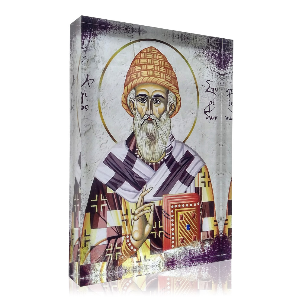 - ΠΡΟΣΤΑΣΙΑ: των Κεραμοποιών και Χρυσοχόων. Βοηθά τους οικονομικά ασθενείς, παρακινεί σε μετάνοια τους αμετανόητους, αλλά ενισχύει και σε νόσους λοιμώδεις, των ματιών και των αυτιών. Προστατεύει από κεραυνούς. Πασίγνωστος για το θαύμα του που κατατρόπωσε τα αιρετικά επιχειρήματα του Αρείου κατά την Α΄ Οικουμενική Σύνοδο.Έβγαλε ένα κεραμίδι και δείχνοντας το, έκαμε με το δεξί του το σημείο του σταυρού κι είπε:— «Εις το όνομα του Πατρός».