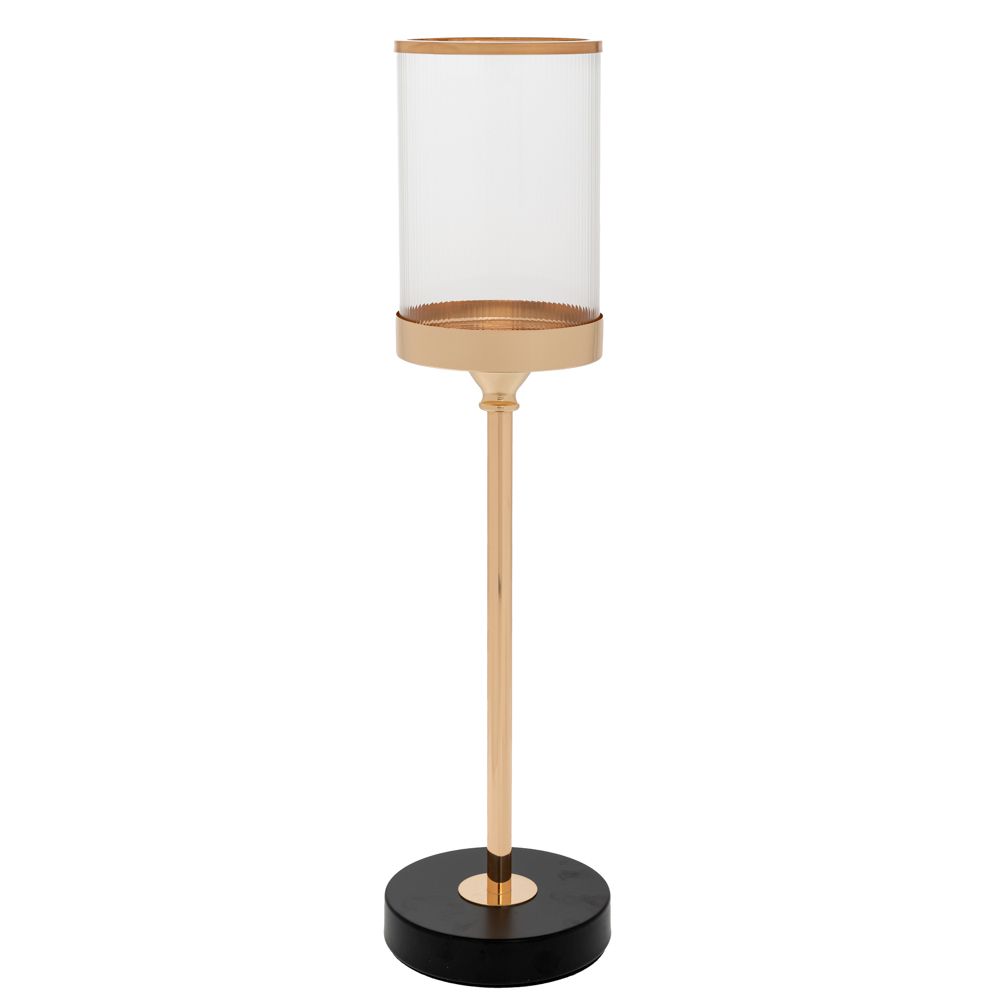 Αναδείξτε την ατμόσφαιρα του χώρου σας με αυτό το κομψό μεταλλικό κηροπήγιο, στο οποίο στηρίζεται γυάλινο ποτήρι για την τοποθέτηση του κεριού.Χρυσό με μαύρες λεπτομέρειες,