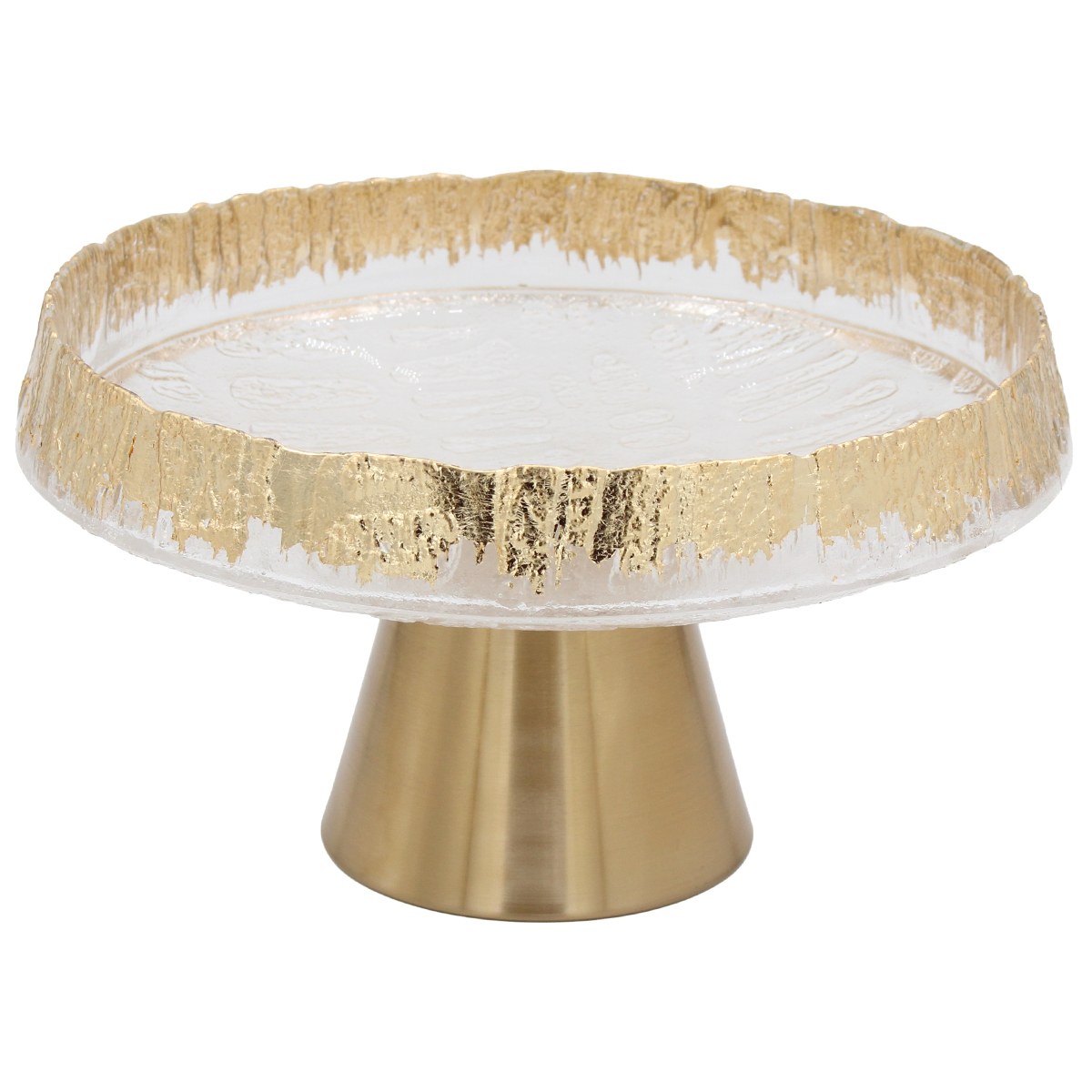 Αυτή η γυάλινη κολωνάτη πιατέλα (Φ23Χ13 εκ.) με χρυσές λεπτομέρειες και μεταλλική βάση προσφέρει κομψότητα και σταθερότητα, ιδανική για σερβίρισμα ή διακόσμηση.