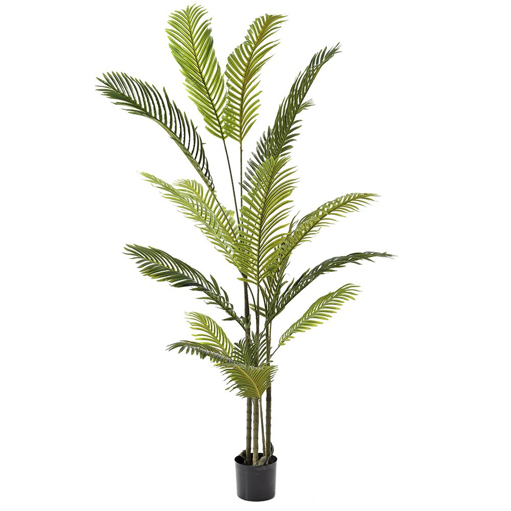 Τεχνητό φυτό φοίνικας αρέκα, ύψους 180εκ. Αποτελείται από 18 φύλλα και βρίσκεται μέσα σε μαύρη πλαστική γλάστρα διαστάσεων 17×15εκ.