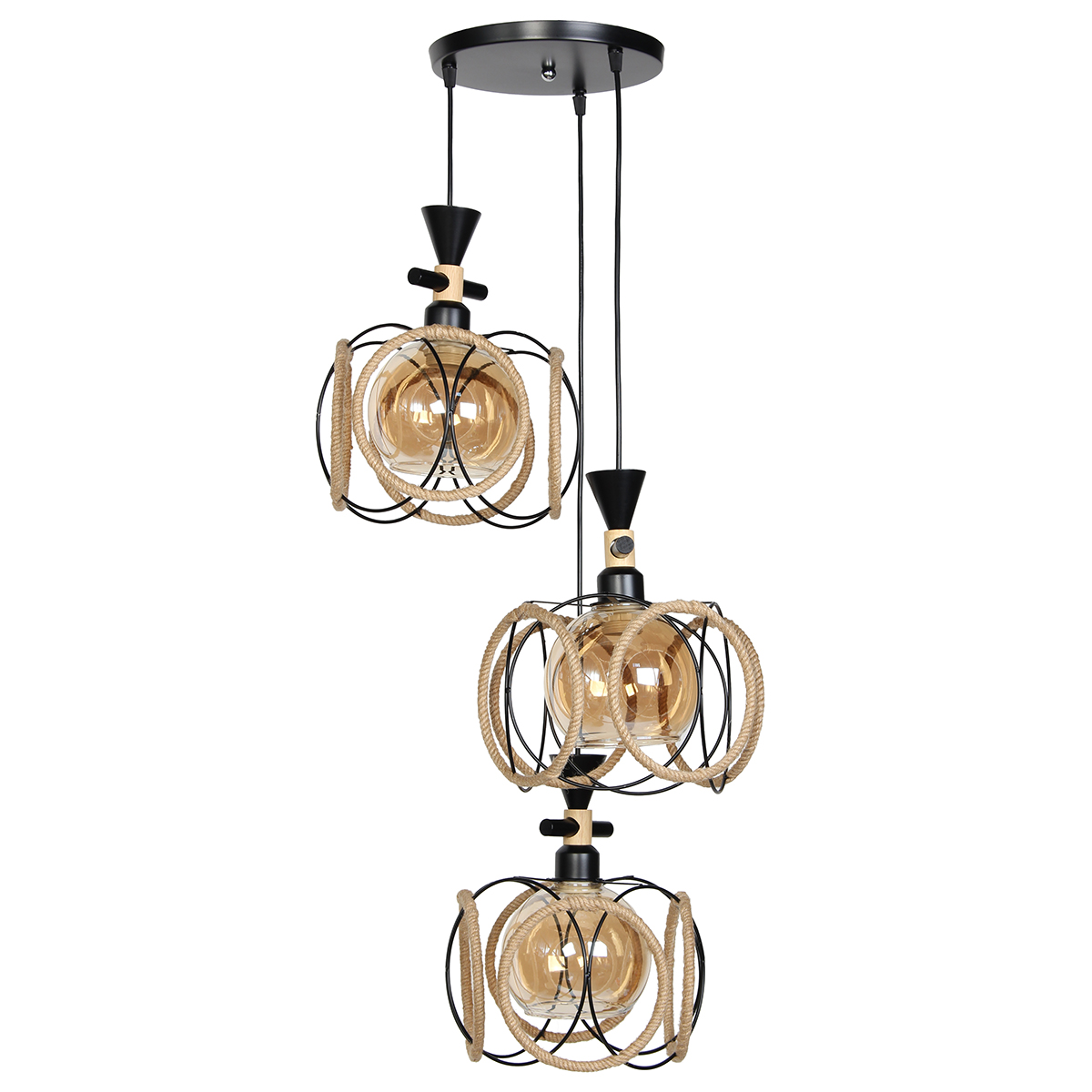 Φωτιστικό μεταλλικό κρεμαστό άνισο 3 Χ Ε27 Φ23 εκ. Μαύρο με σχοινί και γυαλιά