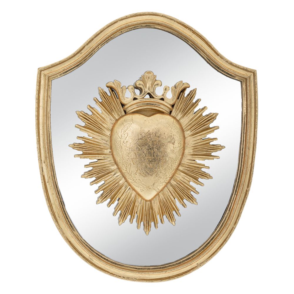 Καθρέφτης μει σκαλιστή κορνίζα σε αντικέ χρυσό φινίρισμα, με το σύμβολο της Ιερής Καρδιάς στο κέντρο.