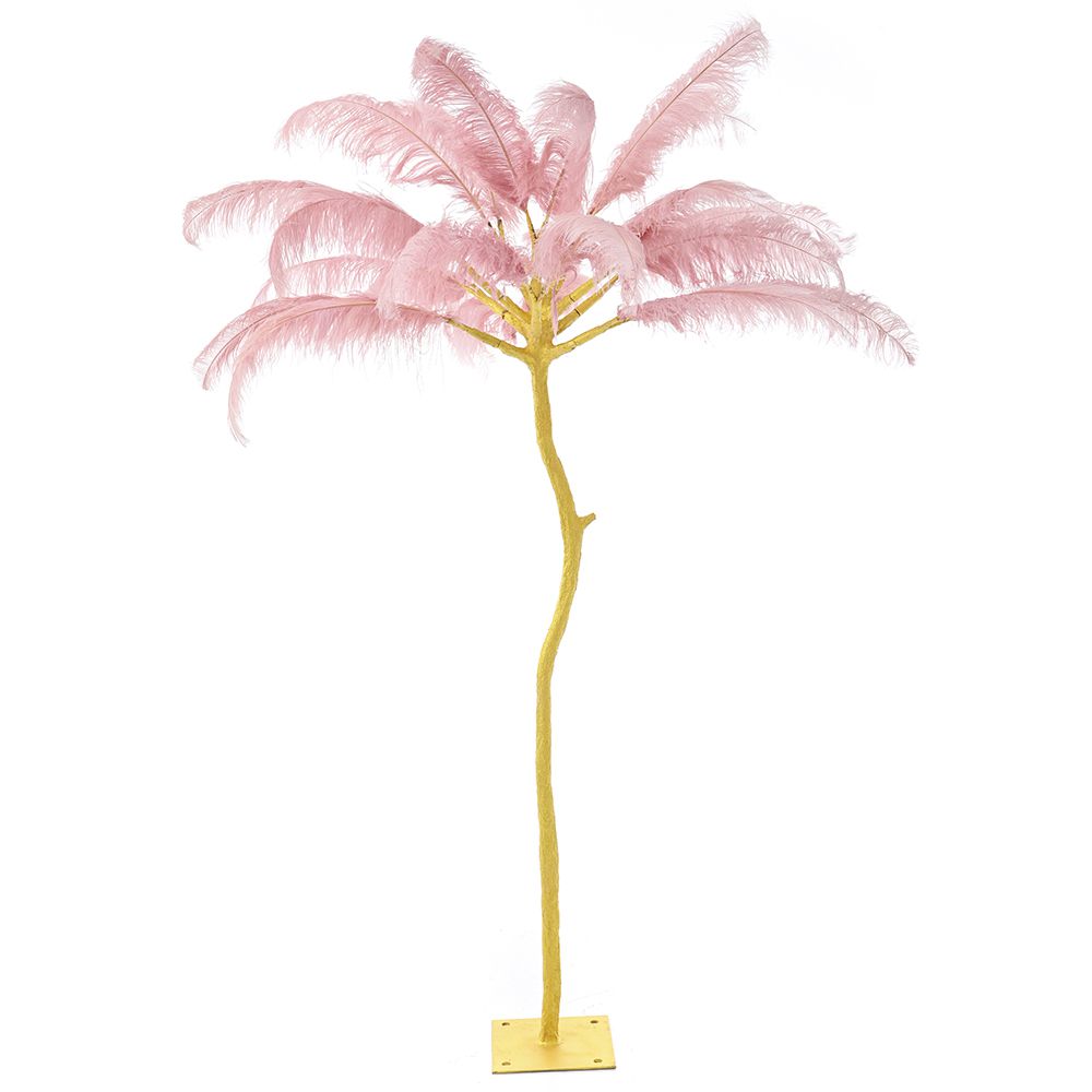 Τεχνητό δέντρο με ροζ πούπουλα στα κλαδιά και χρυσό μεταλλικό κορμό. Το ύψος του είναι 190εκ..