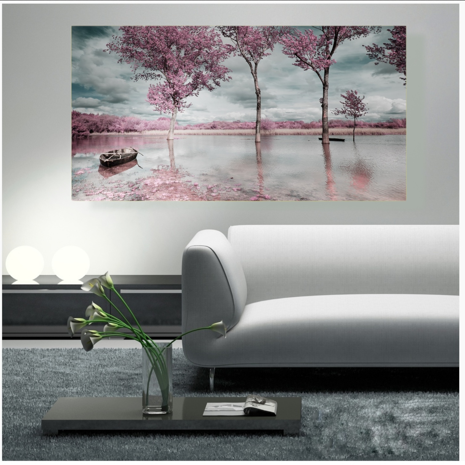 Πίνακας βάρκα σε λίμνη με ροζ δέντρα